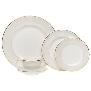 With its ivory and cream tones and beautiful floral scroll detail Gardenia is an elegant pattern.Gardenia is banded in gold and features mica finish that gives the pattern a pearlescent glow.A 5-Piece Place Setting Includes: Dinner plate, Salad plate, Bread & Butter plate, Teacup & Saucer.