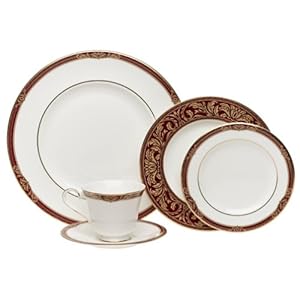 Tennyson's warm tones of burgundy and gold create a look of traditional elegance on this bone china pattern.Banded in 22-caret gold.A 5-Piece Place Setting Includes:Dinner plate, Salad Plate, Bread & Butter plate, Cup and Saucer.