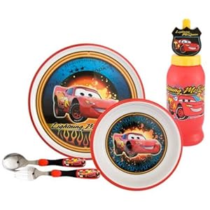 Cars 6-Piece Set includes Plate, Bowl, 9-ounce Tumbler, Squeeze N Sip, Fork and Spoon. Plate and bowl are durable 100% melamine.Tumbler is 9oz capacity with tapered sides that fit children's hands.Squeeze 'n' Sip is16oz capacity with screw on lid and pull up drinking spout.Durable stainless steel tines/spoon with easy grip handles.