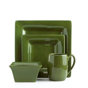 Set yourself up. This simple earthenware dish set includes richly colored pieces needed for a casually smart place setting: square 10.5" dinner plate, 8" salad plate, 5.5" cereal bowl, and 19-oz. mug.
