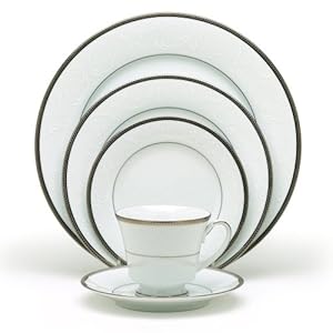 Elegant fashion formal china from Mikasa! A white fine china, with a full rim border decoration in light gray and satin platinum filigree, bordered by polished platinum bands. Parchment has great acceptance from brides and grooms, and sets a beautifull updated table.
