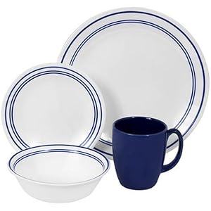 Corelle Livingware 16-Piece Set, Service for 4, includes 4-each 10-1/4-inch Dinner Plates, 6-3/4-inch Bread and Butter Plates, 18-ounce Soup/Cereal Bowls, 11-ounce Stoneware Mugs, Classic Cafe Blue