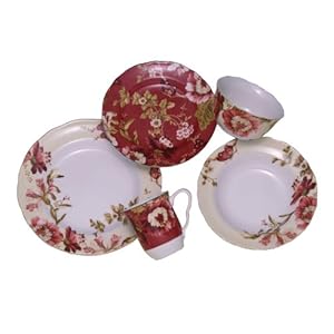 222 Fifth Lutece Dinnerware Set, Service for 4Product Description: Fanciful floral design in deep reds and tea greens, this elegant design is simultaneously classic and modern. Subtly baroque and generous in size, this is a great set for entertaining guests.