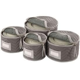 Protect your dishes in this set of 4 plate storage containers. Any type of dish, from the finest China to seasonal dishes can benefit by the use of these protective storage bags. The quilted Microfiber fabric is sturdy and soft, ideal for china storage. Included in this set are 12" Dinner Plate Case, 9.5" Salad Plate Case, 8" Dessert Plate Case and a 7" Saucer Case. Each case comes with 8 cushioned dividers. Save your dishes from nicks and scratches with these protective cases! Hand washable with a mild detergent.These storage sets do not unzip all the way around, however they do unzip approximately 3/4 of theway and the fact that these cases are soft and pliable makes it easy to insert china. Assembly level/degree of difficulty: No Assembly Required.