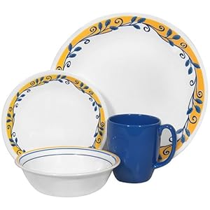 This Corelle set is lovely, almost Italian in style.It's also very inexpensive.The only thing that truly disappointed me upon opening the box was that the cups are stoneware, not traditional "Livingware."As a result, I'm already short one cup, which shattered after hitting the floor.I do not understand why the cups weren't made out of the same material as the dishes and bowls.Other than that, the dishes are light, attractive, stack easily in the dishwasher, and fit well in the cupboard.