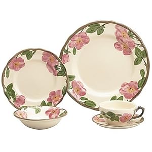 Desert Rose the largest selling pattern in the history of American dinnerware, made its debut in later 1941.It has enjoyed the world's longest period of popularity of any dinnerware pattern produced by a single company. The Rose Rugosa, rugged wild rose of poem and song was a natural design selection. The character of the bloom with its simple delicate petals made it adaptable to hand painting. This beautiful handpaintedpattern is still one of America's favorite casual tableware patterns.In 1964 the sixty millionth piece had been produced and Desert Rose is now on display in the historical Smithsonian Museum. First Lady Jacqueline Kennedy chose Franciscan Desert Rose for use in the White House.In Desert Rose, the irregularly scalloped edge of thorny vines creates a believable frame for the fully opened pink roses with their golden centers and soft green leaves.The softness of the deisgn is further enhanced by its cream colored background.The twenty piece set includes four of each, 10.5 inch dinner plate, 7.75 inch salad plate, 6 inch soup/cereal, teacup and saucer. All pieces are microwave, freezer and dishwasher safe.Accessories are also available.