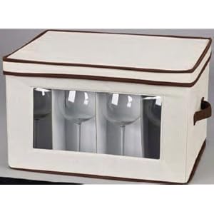 Store glassware safely in this cotton canvas storage chest from WHITNEY DESIGN.This chest is designed to hold 12 each balloon style stemware.It is tan in color with chocolate brown piping and the front panel has a clear see-through window to allow the contents to be seen.Cardboard dividers are provided to store a service for 12.Two handles on the side are attached by rivets and can support weight up to 25 pounds.The chest setup size is8-1/2-inch by 18-1/2-inch by 14-inch .