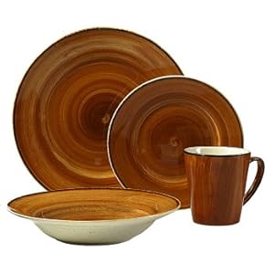The brown glass of the Kenya 16-pc. Dinnerware set has an elegant look and fits right in with a contemporary-style décor. Mugs have a large, comfortable handle, ideal for enjoying a leisurely cup of after-dinner coffee with friends. Set includes four each: 10-1/2" dinner plate, 8" salad plate, 9" bowl and 3-3/4" cup. Service for 4. Stoneware. Dishwasher and microwave safe. Imported.