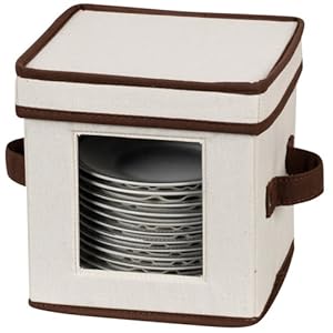 Stylish and durable, this smart storage chest gently cradles a generous stack of dinnerware for a lifetime of chip- and crack-free protection. Designed to hold up to 12 standard-sized saucers, the unit provides sturdy walls in a blend of polyester and cotton canvas, plus a large see-through window for easy review of inside contents. Its two riveted side handles can support a load up to 25 pounds, allowing for secure transportation and storage of china, crystal, or everyday dishware. Additionally, the unit comes with felt protectors that slip between each dish, preventing needless bumping and chipping. It features an attractive exterior with contemporary edging, and a matching lid to protect the contents from moisture and dust. The storage chest measures 8 by 8 by 7-1/2 inches.