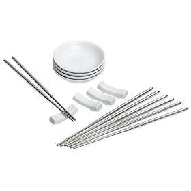 Global Décor Asian Dinner Set includes 8 Stainless Steel Chopsticks, 4 white Sauce Bowls, and 4 white Chopstick Rests