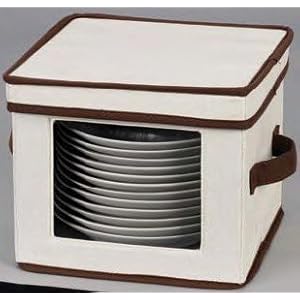 Store dinnerware safely in this cotton canvas storage chest from WHITNEY DESIGN.This chest is designed to hold either 12 each dessert plates or bowls.It is tan in color with chocolate brown piping and the front panel has a clear see-through window to allow the contents to be seen.Felt protectors are provided that slide between plates and/or bowls for up to a set of 12.Two handles on the side are attached by rivets and can support weight up to 25 pounds.The chest setup size is 8-inchby 9-inchby 9-inch.