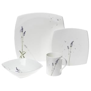 Mikasa square bone china is trend-setting and elegant, as appealing to the contemporary tablesetting or that with asian influences. "Lavender Lane" graces the all white dinnerware pieces with a single spray of lavender on each piece, giving this an updated English feel .