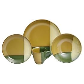 Sango Gold Dust 16-Piece Dinnerware Set, Service For 4Product Description: A unique look of reactive glazes applied through a multiple dipping process.A soft matt finish of predominantely soft Green and Brown.The set consists of four (4) each: dinner plate (10.5"), salad plate (7.5"), soup/cereal bowl (8") and mugs (12 oz).