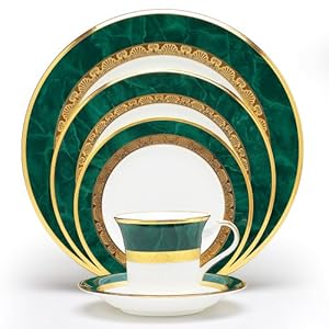 Fitzgerald features a wide rim of marbleized green with an outer band of smooth gold and an inner band of etched gold. Dishwasher safe on a fine china setting.